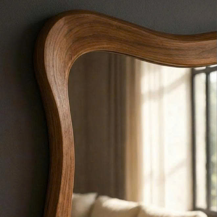 Chiếc gương treo tường với thiết kế bo viền uốn lượn mềm mại mang phong cách hiện đại, giúp không gian trở nên sang trọng và nghệ thuật hơn. Phù hợp cho phòng khách, phòng ngủ, showroom, spa hoặc cửa hàng thời trang.