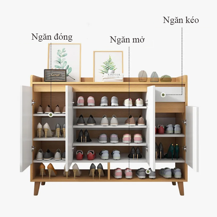 Không gian tủ lớn giúp đựng được nhiều giày dép. Bên trong tủ đựng giày dép được chia làm 4 ngăn. Chiều cao mỗi ngăn là 15cm, giúp bạn có thể để được những đôi cao gót hơn 10cm, hoặc những đôi giày boot 15cm mà không làm móp méo giày dép.